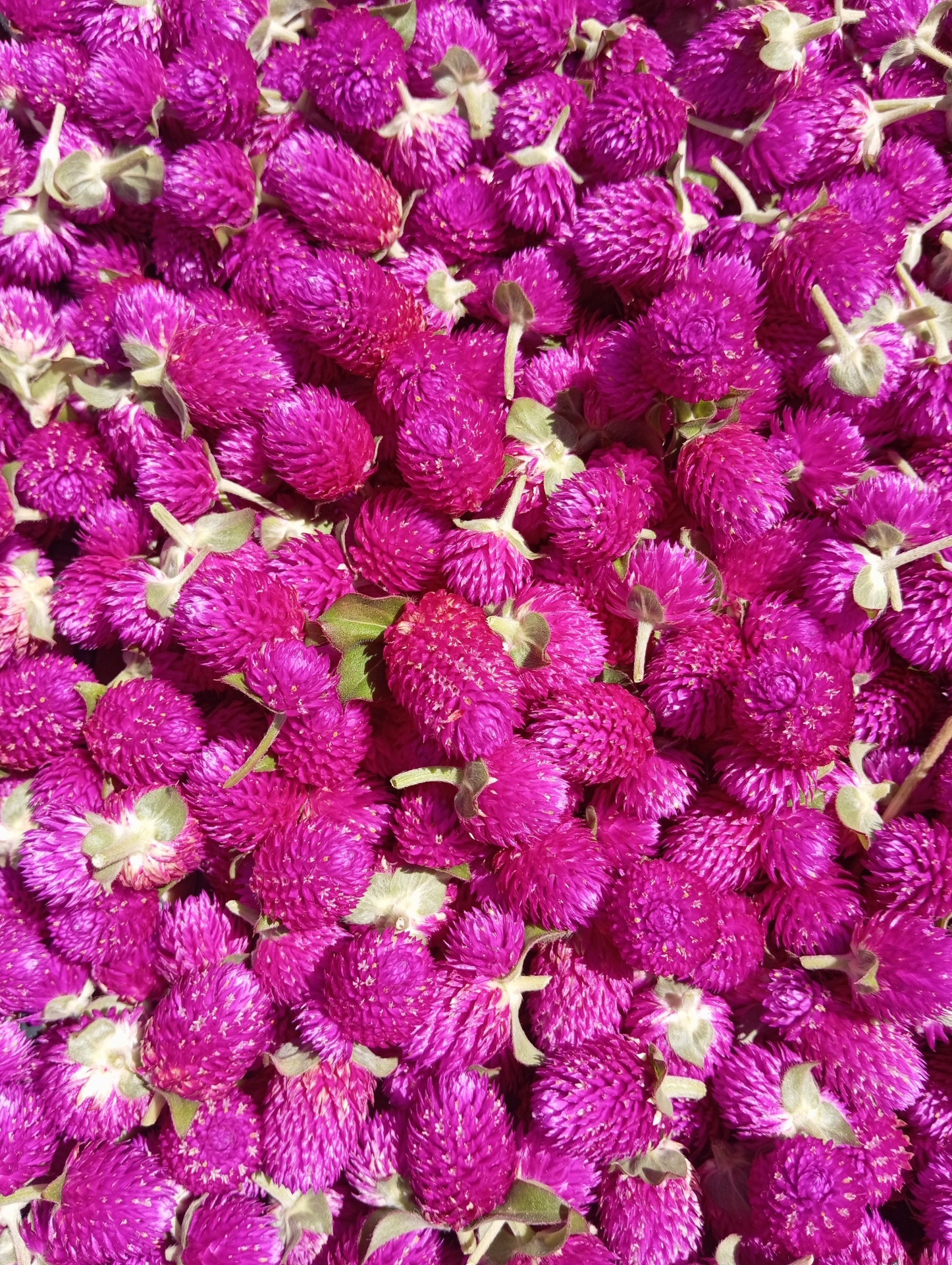 • Flores pequenas rosa vibrante com caules curtos e folhas verdes claras.