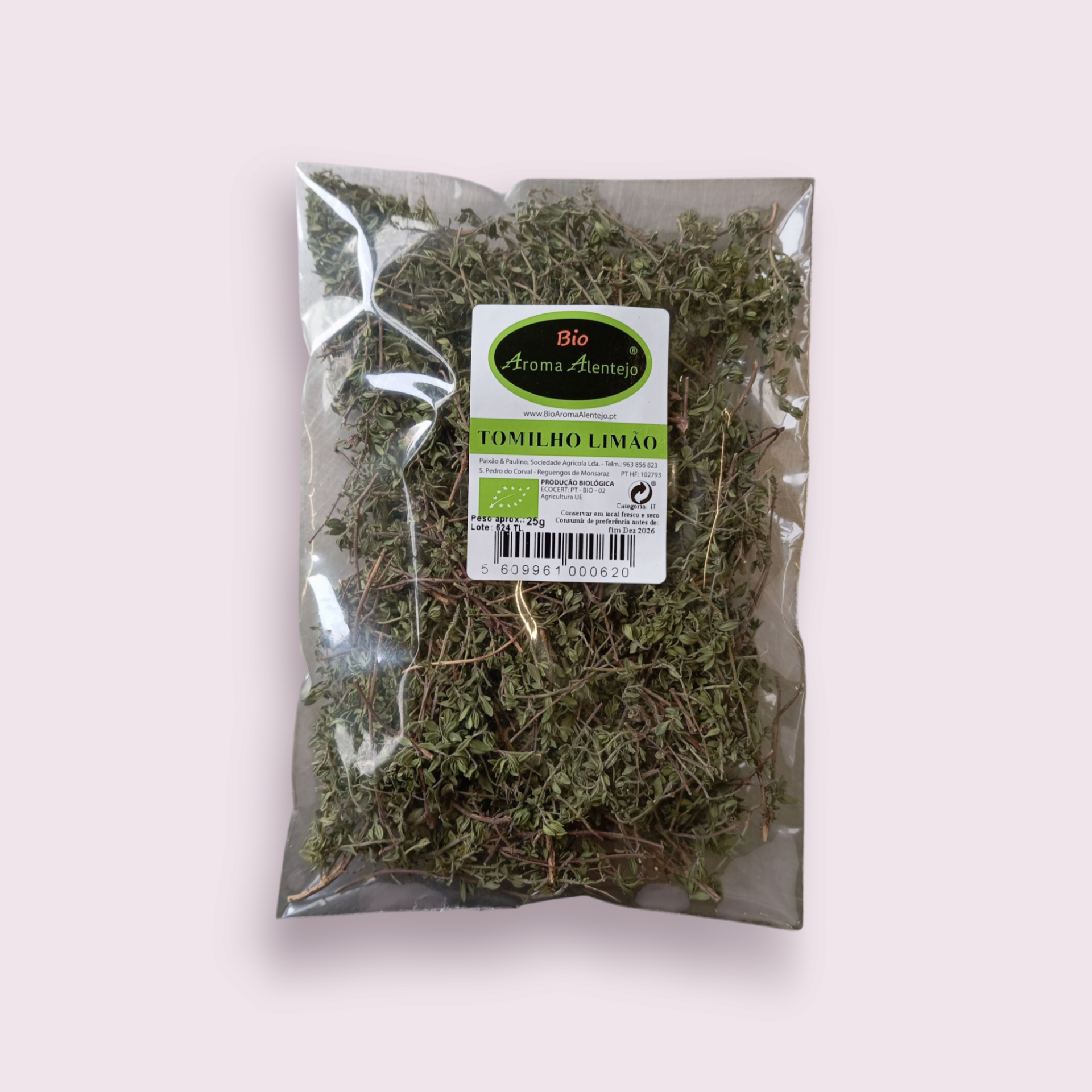 • Pacote transparente com tomilho limão seco e rótulo branco da marca Bio Aroma Alentejo
